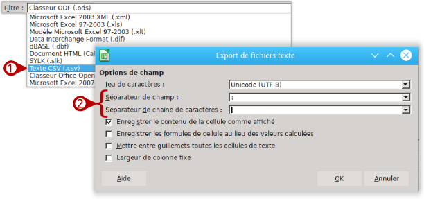 Dans Fichier, aller sur ① Enregistrer sous. Dans la boite de dialogue ② qui s’ouvre ensuite vérifier que le séparateur de champ est bien le point-virgule ( ;) et qu’il n’y a pas de séparateur de chaine de caractère. Effacer ce dernier s’il y en a un (a priori il y en a un).