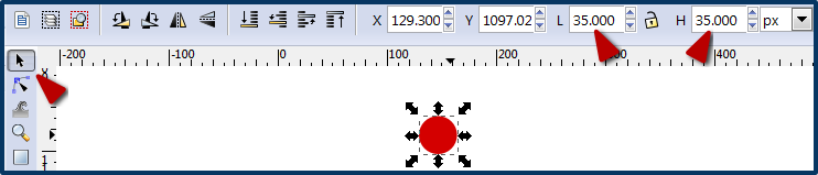 Les boules demandent plus de temps. On commence par dessiner un rond avec l’outil adéquat. Et, pour bien vérifier que c’est bien rond et pas seulement à peu près rond, le cercle étant sélectionné, on clique sur la flèche en haut à gauche de la barre d’outil pour faire apparaître les coordonnées et les dimensions : la largeur doit être la même que la hauteur.
