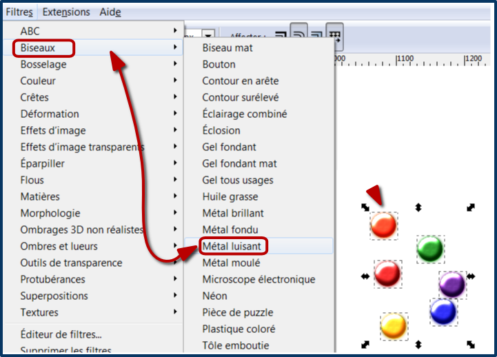 Sélectionner les boules , aller dans le menu Filtre/Biseaux, sélectionner celui que l’on veut utiliser, et c’est tout.