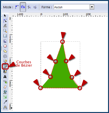 Cliquer sur l’outil Courbes de Bézier d’Inskcape. Dessiner la forme, ici un genre de triangle : vous devez procéder par petites touches, tirer un trait, cliquer, tirer un trait, cliquer, etc. cela va créer autant de poignées de sélection qui permettront par la suite d’affiner le dessin. Cette façon de faire permet de générer des formes très souples et malléables, arrondies ou non. Pour une forme aussi basique, six à dix points suffisent largement.