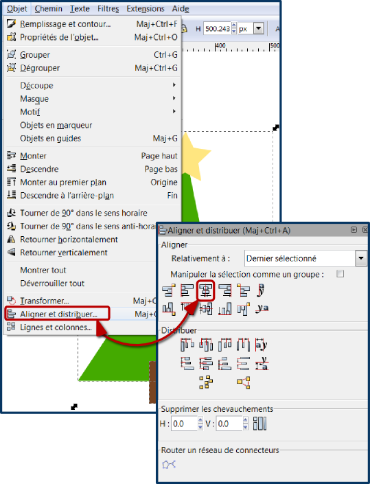 Enfin, pour finir on sélectionne nos trois éléments, à la souris ou en cliquant sur chacun en maintenant la touche Ctrl enfoncée et on va dans le menu Objet/Aligner et distribuer pour bien centrer nos trois dessins les uns par rapport aux autres.