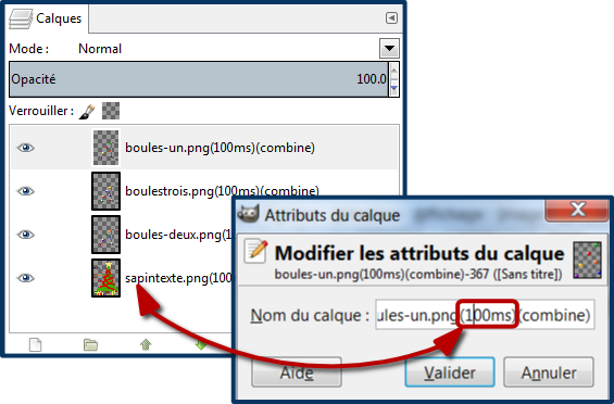 Aller dans Filtre/Animation/Optimiser pour gif (on peut choisir d’autres effets, à vous de tester). Gimp crée un nouveau fichier sur lequel il faut aller pour voir l’animation, puis : Filtre/Animation/Rejouer l’animation. Si c’est trop rapide, et ça l’est sûrement, ouvrir la fenêtre ancrable Calques si elle n’apparaît pas à l’écran (Fenêtres/Fenêtres ancrables). Puis clic droit sur chaque élément du calque et Modifier les éléments du calque, changer la vitesse qui est en millisecondes.