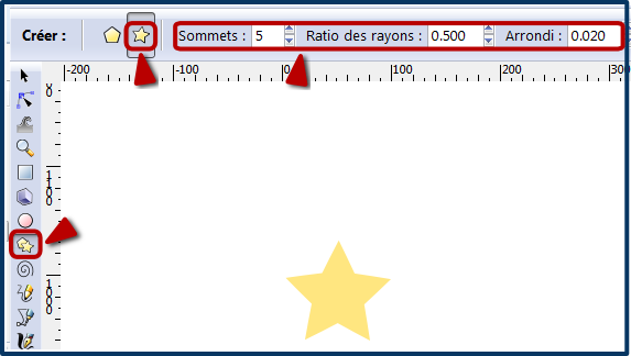 Pour l’étoile, rien de plus simple, on sélectionne l’outil Étoiles et polygones, on appuie sur la bonne option, on paramètre le nombre de branches, ainsi que la profondeur des rayons et la rotondité des branches et on dessine l’étoile, on la colorie et on la glisse au sommet du « sapin ».