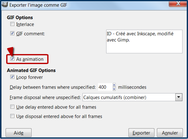 Pour finir, Exporter le fichier (menu Fichier) ainsi obtenu. Pour que l’image soit bien animée il faut impérativement cocher l’option As Animation.