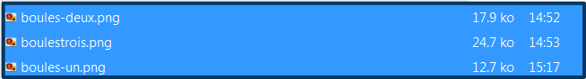 On a donc, ici, trois fois le même rectangle avec les mêmes boules. On en garde un. Pour faire un set de boules avec chacun des deux jeux : on glisse les boules les unes après les autres sur (en fait elles seront dessous) celles d’un des deux sets copié-collé, et on supprime la boule du dessus. Ainsi nos décorations seront toutes à la même place quand on va enregistrer chaque cadre séparément pour faire des images au format png que Gimp va utiliser pour le gif animé.