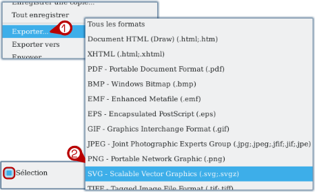 Fichier > Exporter[2] ou faire un clic-droit etEnregistrerqui propose d’emblée le format svg ; - vérifier, en bas à gauche que la case